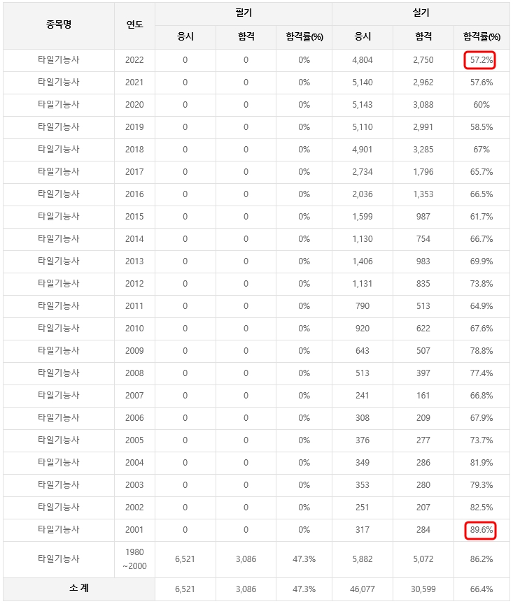 - 타일기능사는 필기가 없다. 아래 표를 보면 실기합격률이 가장 높을때는 2001년 89.6%이고, 가장 낮을때는 2022년에는 57.2%이다. 타일기능사는 필기가 없어 실기에만 치중하면 되기 때문에 어떻게 보면 취득하기 더 수월한 것 같다는 생각이 든다.